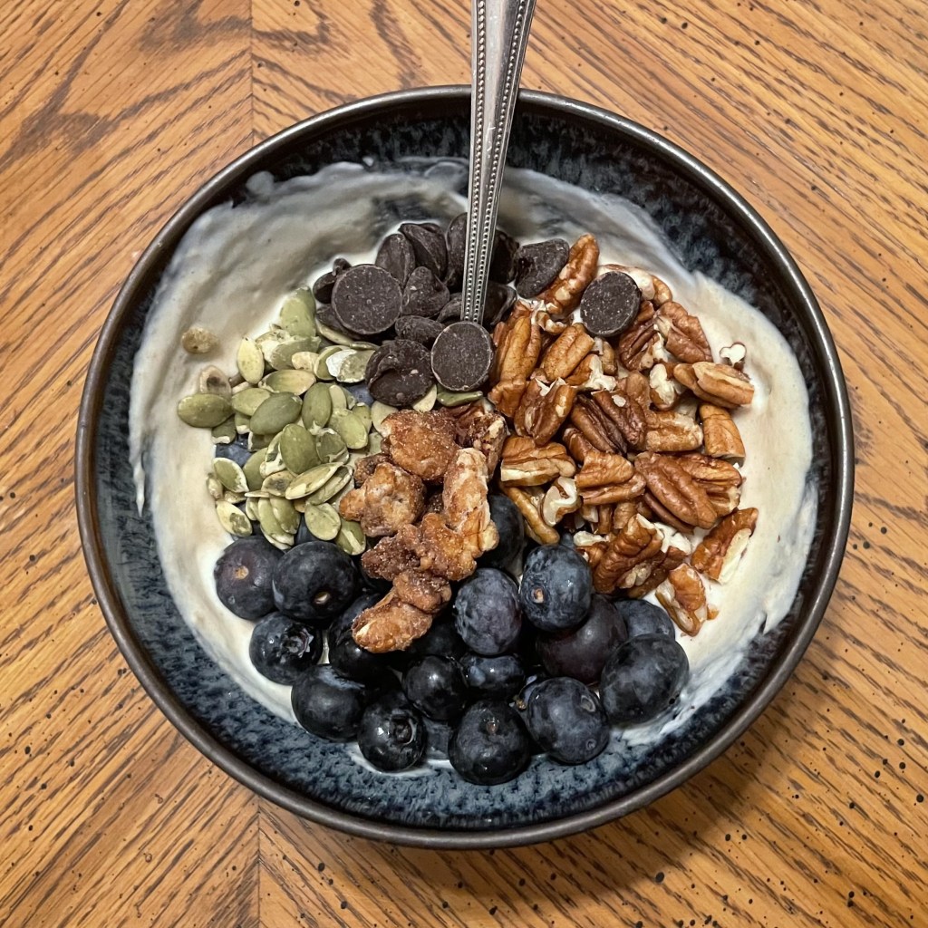 Anyway, this peanut butter yogurt is one of my go-to evening snacks as a tasty treat. If you’re hungry, it can be boosted to be even more satisfying. My favorite mix-ins are pecans (halves broken down a bit into smaller pieces), dark chocolate chips, pumpkin seeds (if I have them) and blueberries (if I have them). Sometimes I have an extra little something on hand like chocolate covered pretzels or old cookies that I’ll crumble into the mix.